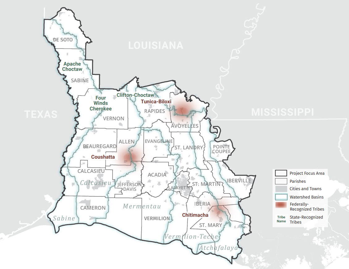 The project will bring together two existing regional groups, Louisiana Watershed Initiative (LWI) Region 4 and the Acadiana Planning Commission/LWI Region 5, to focus on shared challenges and strategies for collaboration on solutions. The LWI regions, with their parishes and cities, as well as Tribes who choose to participate, will constitute a Governance Committee for the project.